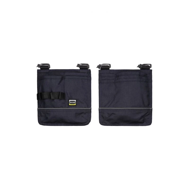 CORDURA®, plátnová vazba, 100 % polyamid, samostatné kapsy z extra pevného materiálu CORDURA®, lze připevnit k pracovním kalhotám pomocí spon (kromě T66), reflexní prvky, 20 cm x 18 cm, 1 kus = 1 pár, kód produktu Tricorp: 652012