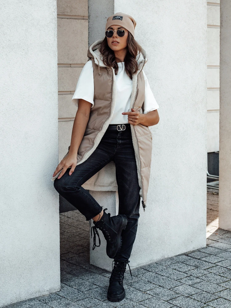 COSYVIVA dámská dlouhá prošívaná vesta s kapucí béžová FashionStreet TY4602