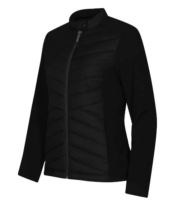 kombinace prošívaného a softshellového materiálu střih tvarovaný bočními díly stojáček na druk celopropínací spirálový zip boční kapsy se spirálovým zipem vnitřní náprsní kapsa na zip vstup pro branding v podšívce zadního dílu