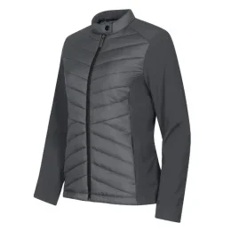 kombinace prošívaného a softshellového materiálu střih tvarovaný bočními díly stojáček na druk celopropínací spirálový zip boční kapsy se spirálovým zipem vnitřní náprsní kapsa na zip vstup pro branding v podšívce zadního dílu