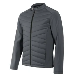 kombinace prošívaného a softshellového materiálu rovný střih s bočními díly stojáček na druk celopropínací spirálový zip boční kapsy se spirálovým zipem vnitřní náprsní kapsa na zip vstup pro branding v podšívce zadního dílu