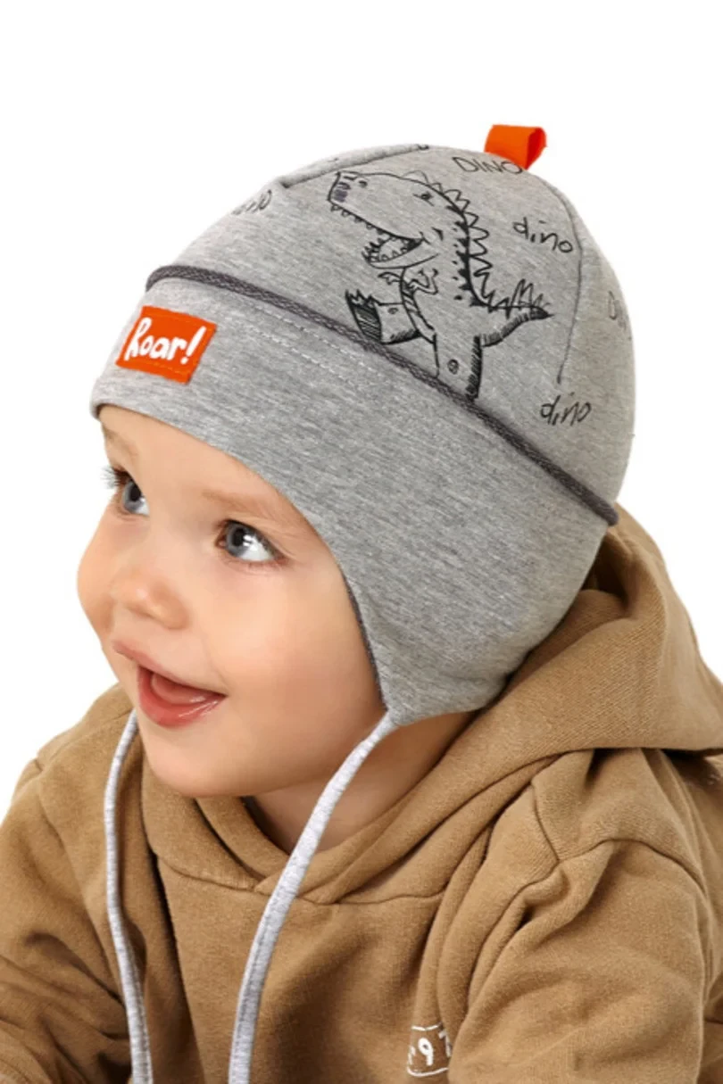 Vázaná chlapecká čepice s potiskem dinosaurů. Contr. sur. materiál: 95% bavlna, 5% elastan
