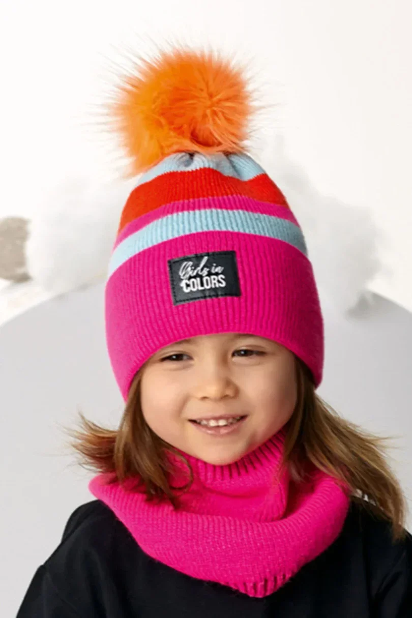 Dívčí čepice s bambulí, podšitá bavlnou. Suroviny: 90% akryl, 10% vlna, podšívka: 95% bavlna, 5% elastan