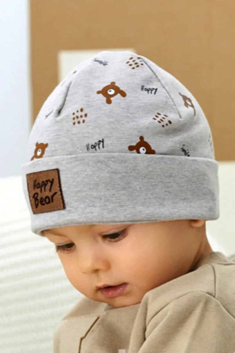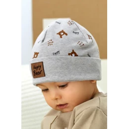 Tenká chlapecká čepice z jednoduché bavlny, ohrnutá, s potiskem medvídka a nášivkou. Složení: 95% bavlna, 5% elastan