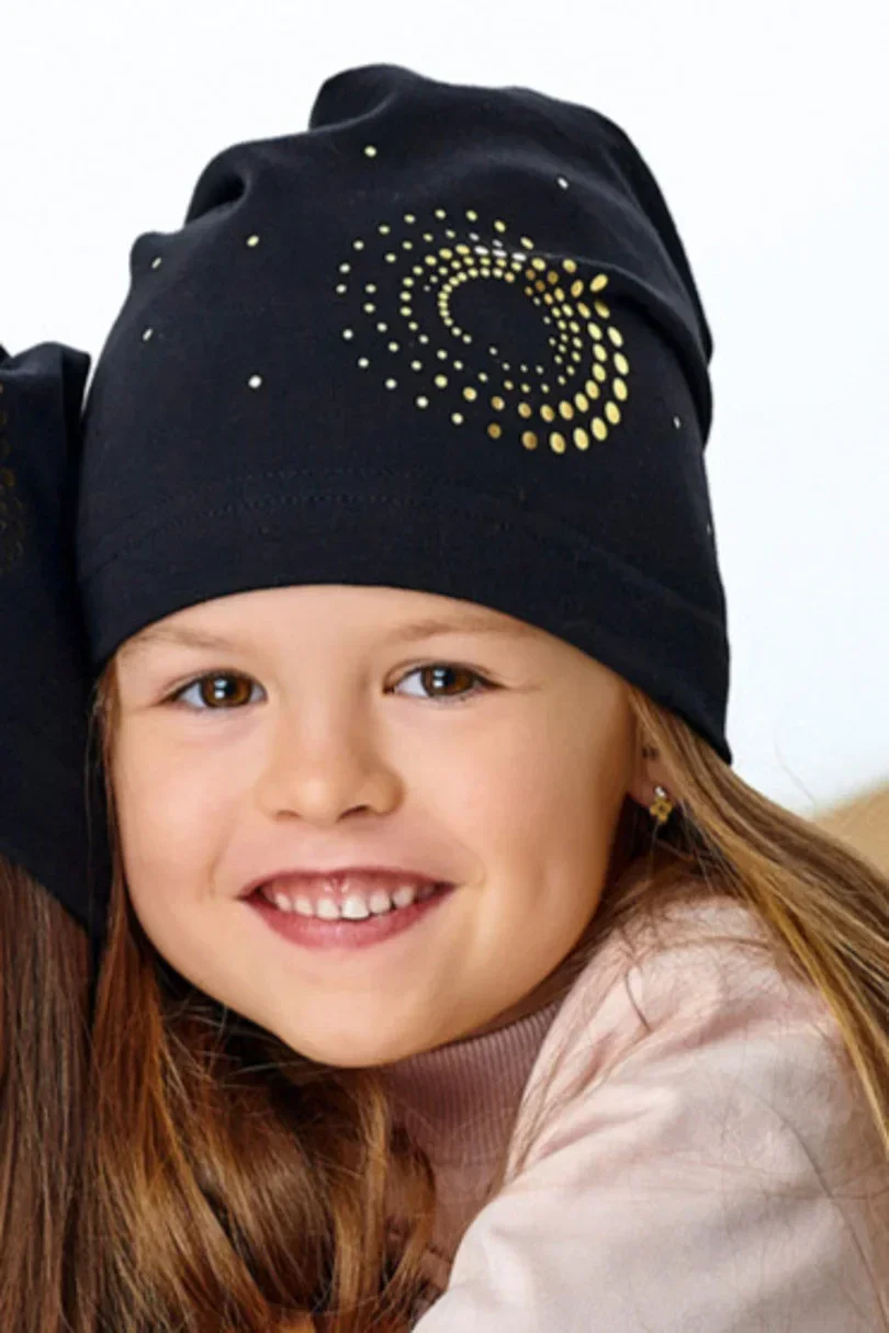 Tenká dívčí čepice z jednoduché bavlny se zlatou aplikací.Složení: 95% bavlna, 5% elastan