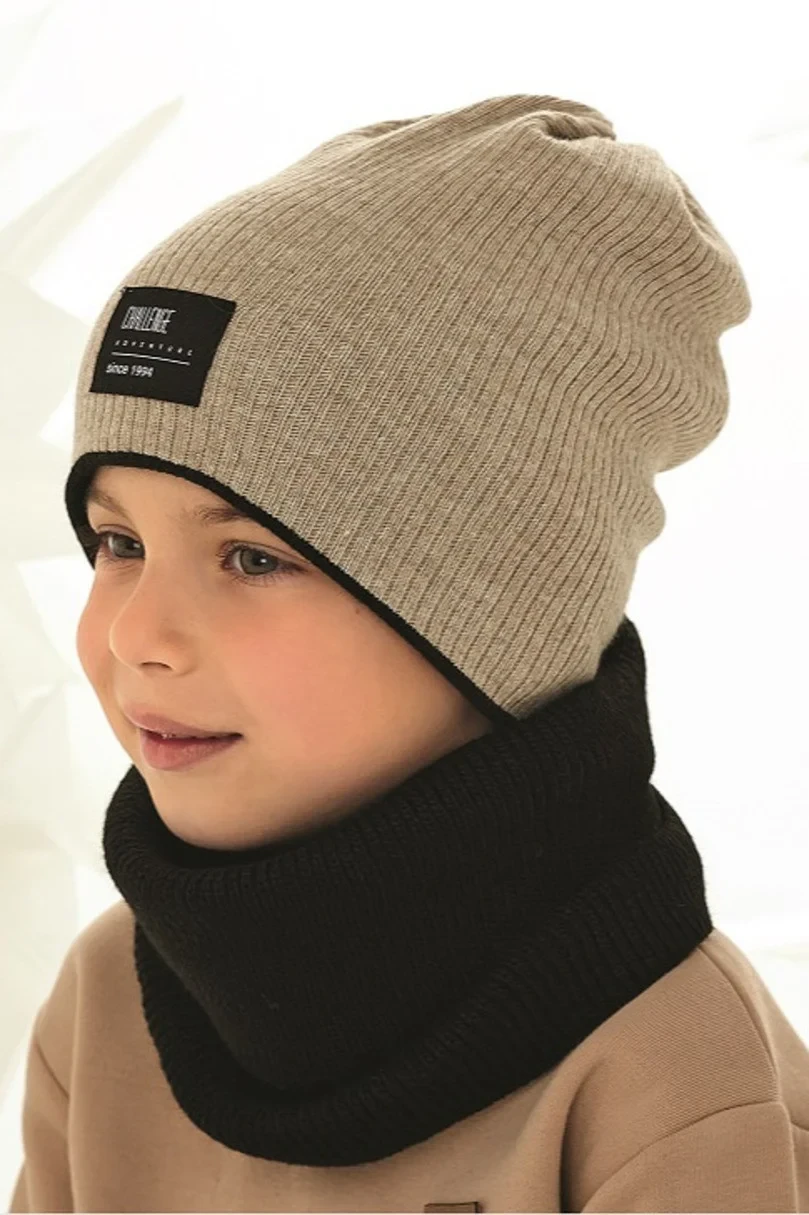 Oboustranná chlapecká čepice. Mírně prodloužený model, jedna strana s nášivkou, druhá hladká.