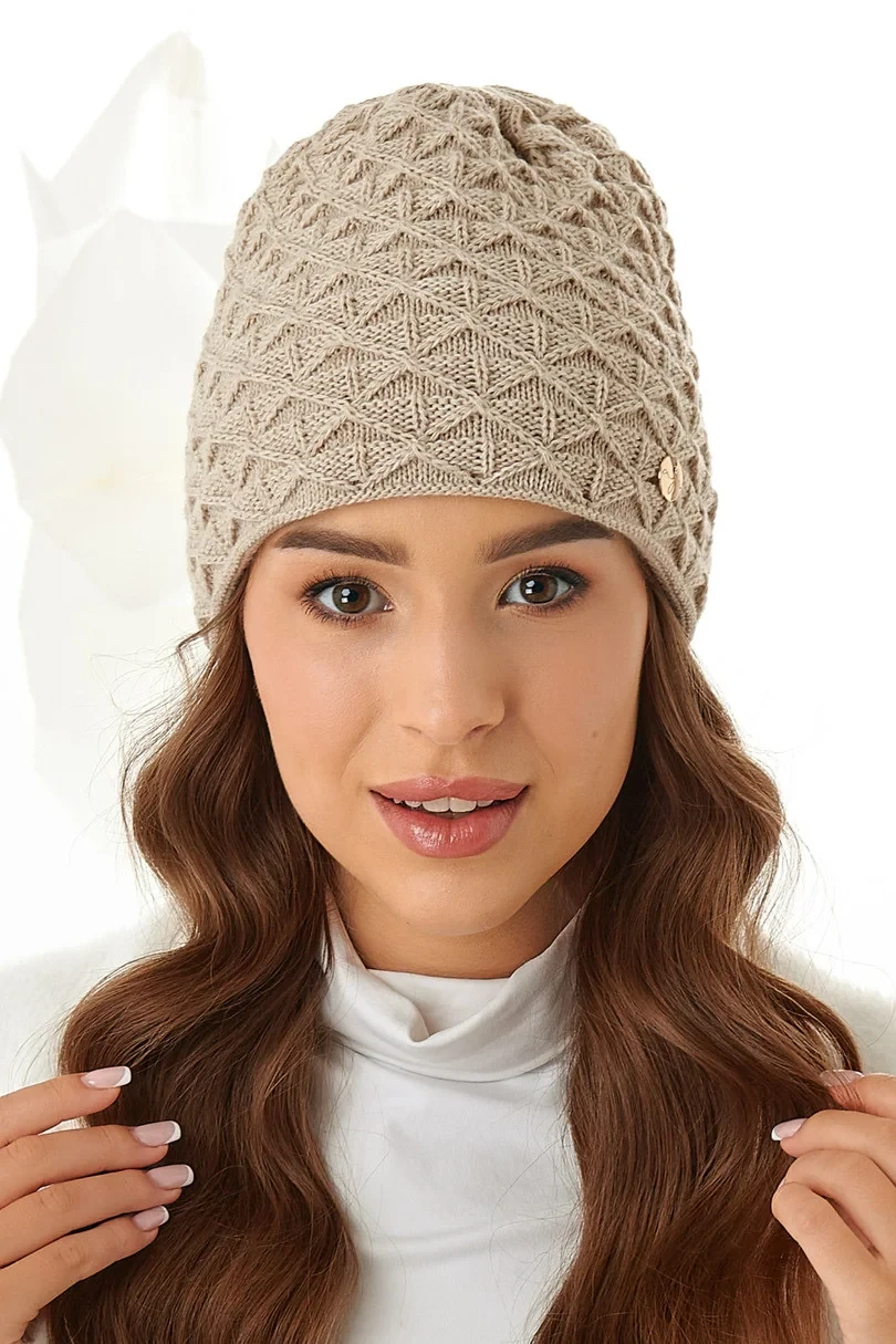 Dámská čepice z dvojité vrstvy hřejivé příze příjemné na dotek, zdobená vzorovaným stehem a malou třpytivou zirkonovou ozdobou.