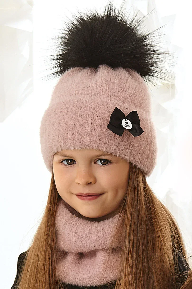 Dívčí souprava: čepice s huňatou bambulí a komínem, zdobená malou mašlí a kovovým přívěskem, rolák s třásněmi.