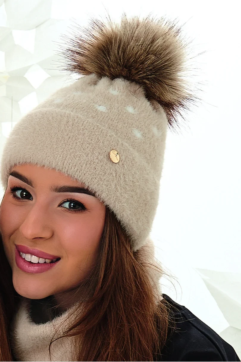Dámská čepice a šnorchl z mimořádně příjemného na dotek a hřejivého polyamidu. Čepice a šnorchl v jedné vrstvě s ohrnovacími šňůrkami. Čepice zdobená malou zlatou visačkou s logem firmy a zirkony.