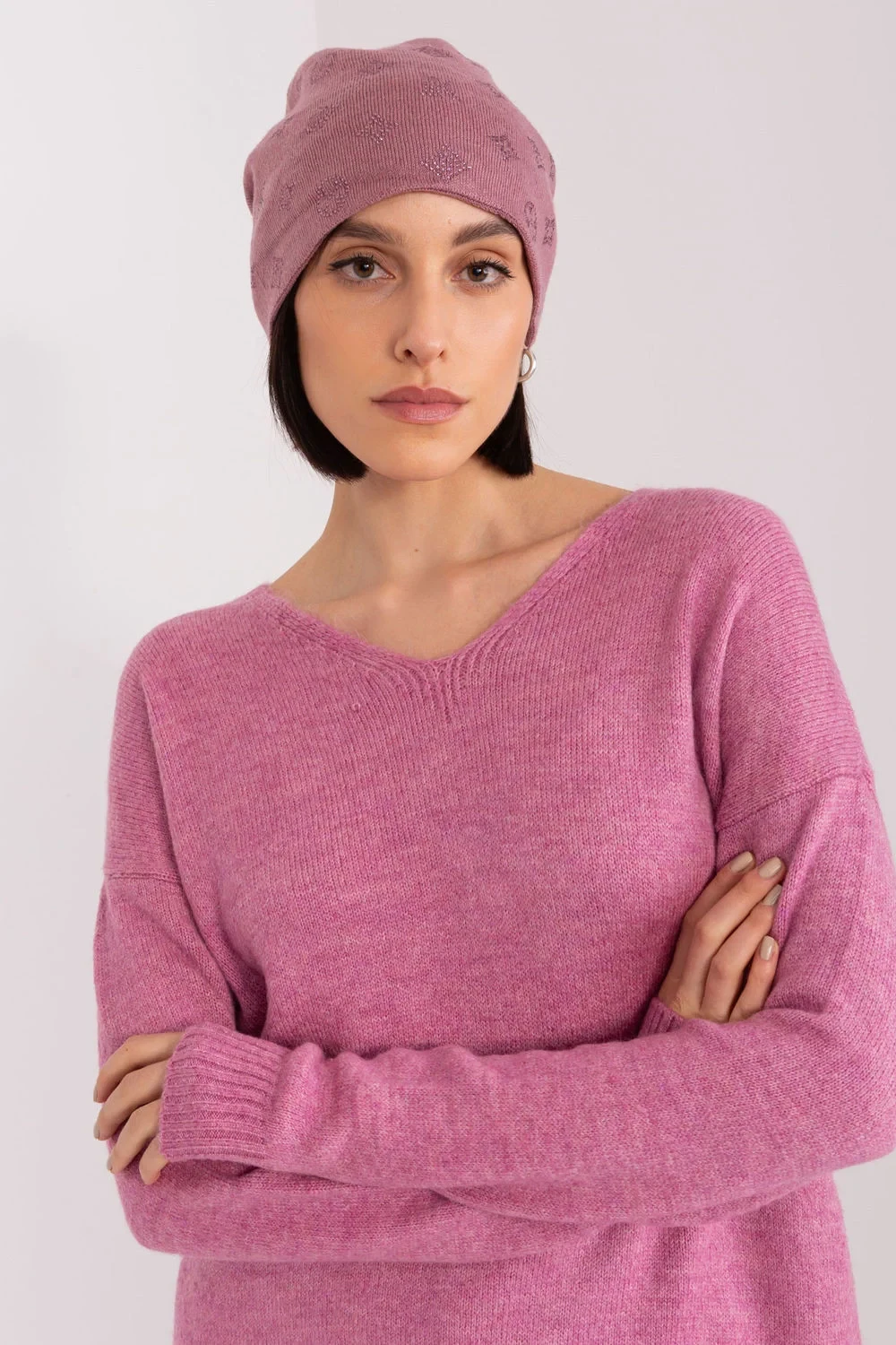 Hřejivá dámská zimní čepice z kašmíru s ozdobnou kamínkovou aplikací.