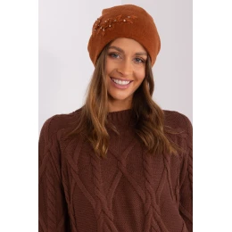Hřejivá dámská zimní čepice z hladkého úpletu s ozdobnou aplikací na boku.