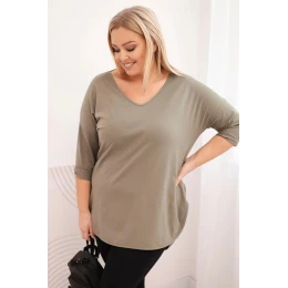 Dámská bavlněná blůza Plus Size s výstřihem do V a ohrnovacími rukávy khaki