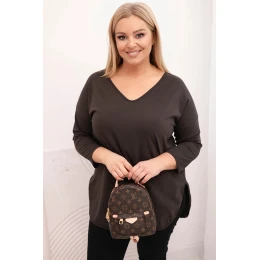 Dámská bavlněná blůza Plus Size s výstřihem do V a ohrnutým rukávem hnědá