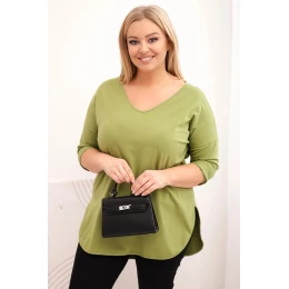 Dámská bavlněná blůza Plus Size s výstřihem do V a ohrnutým rukávem olivová