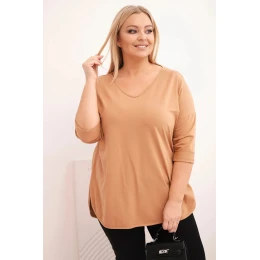 Dámská bavlněná blůza Plus Size s výstřihem do V a ohrnutými rukávy camelová