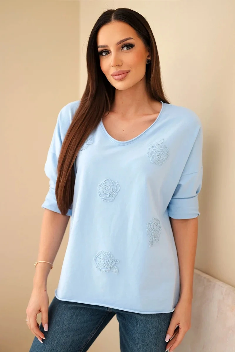 Dámská bavlněná blůza s vyšívanými květinami a V výstřihem modrá