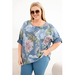 Dámská bavlněná blůzka Plus Size s krátkým rukávem a květinovým vzorem džínová