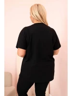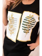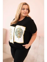 Tato dámská halenka s krátkým rukávem je ideální volbou pro ženy, které si cení pohodlí a stylového vzhledu na každý den. Její volný střih typu oversize skvěle padne na postavu a zajišťuje naprostou volnost pohybu. Ozdobný potisk s motivem listů ve zlatém provedení, doplněný o jemné kamínky a kontrastní pruhy, dodává halence módní a poutavý charakter. Halenka je skvělá jak pro každodenní nošení, tak i na setkání s přáteli nebo víkendové vycházky. Měkký materiál s převahou bavlny je příjemný na dotek a prodyšný, což zajišťuje vysoký komfort nošení i po celý den. Univerzální střih se hodí k legínám, džínům i sukním. Model je určen pro ženy, které nosí velikosti Plus Size – XXL, XXXL a větší.