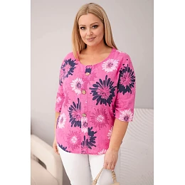Halenka má klasický kulatý výstřih a dekorativní knoflíky vpředu, které jí dodávají jemné kouzlo. Krátký rukáv zajišťuje volnost pohybu a pohodlí i během teplejších dní. Volnější střih typu Plus Size způsobuje, že model se krásně přizpůsobí postavě a hodí se k mnoha stylizacím – jak s džínami, šortkami, tak s lehkými kalhotami nebo sukní.