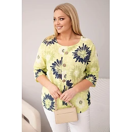 Halenka má klasický kulatý výstřih a dekorativní knoflíky vpředu, které jí dodávají jemné kouzlo. Krátký rukáv zajišťuje volnost pohybu a pohodlí i během teplejších dní. Volnější střih typu Plus Size způsobuje, že model se krásně přizpůsobí postavě a hodí se k mnoha stylizacím – jak s džínami, šortkami, tak s lehkými kalhotami nebo sukní.