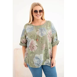 Dámská bavlněná halenka Plus Size s krátkým rukávem a květinovým vzorem khaki