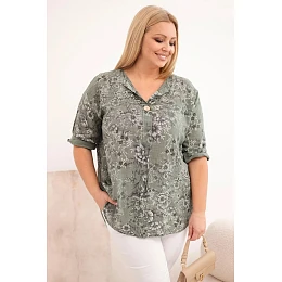 Dámská bavlněná halenka Plus Size s krátkým rukávem a ozdobným knoflíkem khaki