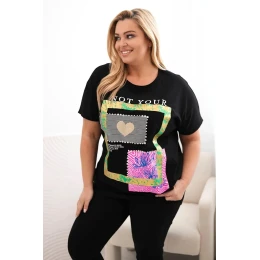 Tato dámská halenka s krátkým rukávem je ideální volbou pro ženy, které oceňují pohodlí a styl v jednom. Vyrobena z měkké, příjemné bavlny s příměsí elastanu, skvěle sedí na postavě a zajišťuje pohodlí po celý den. Volný střih umožňuje volnost pohybu a poutavý potisk se zlatým srdcem a barevnými detaily jí dodává výjimečný charakter. Tato halenka se hodí jak na každý den, tak na setkání s přáteli nebo volnější příležitosti – stačí ji zkombinovat s oblíbenými džínami nebo legínami. Díky módnímu designu a univerzálnímu střihu je skvělým doplňkem každého šatníku. Model určený pro ženy nosící velikosti Plus Size – XXL, XXXL a větší.