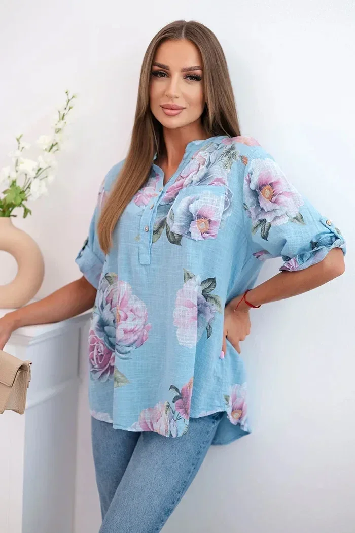 Hledáte lehkou a vzdušnou halenku, která zdůrazní váš ženský styl? Tato dámská bavlněná halenka s květinovým vzorem je ideální volbou pro teplé dny! Její volný střih a jemný materiál zajišťují naprosté pohodlí. Krátký rukáv a mírně prodloužená zadní část jí dodávají moderní vzhled a výstřih do V s knoflíky a praktickou kapsou na hrudi přidávají ležérní šarm. Skvěle se hodí k džínám, šortkám nebo sukním – ideální na každý den, letní procházku nebo setkání s přáteli. Velikost je univerzální a bude vhodná pro ženy velikosti S, M nebo L.