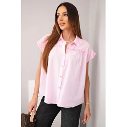 Dámská bavlněná košilová halenka s krajkou a krátkým rukávem bonbónově růžová