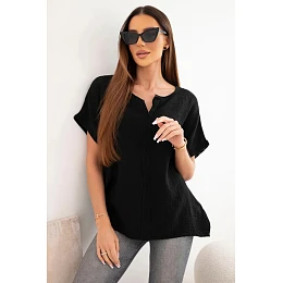 Dámská bavlněná mušelínová oversize halenka s výstřihem do V a krajkou černá
