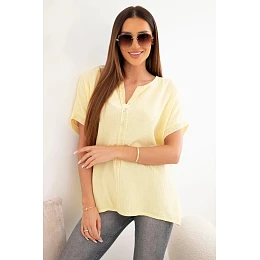 Dámská bavlněná mušelínová oversize halenka s výstřihem do V a krajkou žlutá