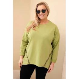 Dámská blůza Plus Size bavlněná s ohrnutým rukávem a lampasem v leopardím vzoru olivová