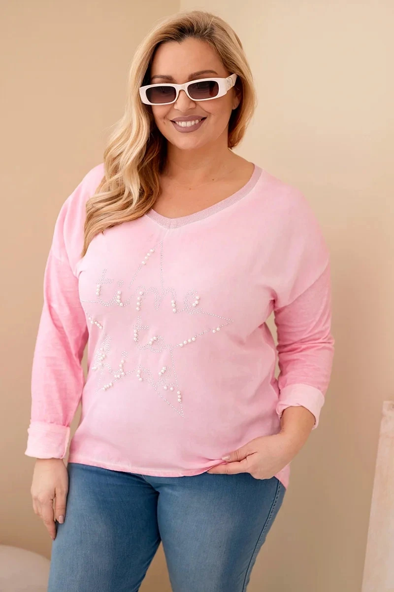 Dámská blůza Plus Size s potiskem a perlami světle růžová