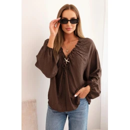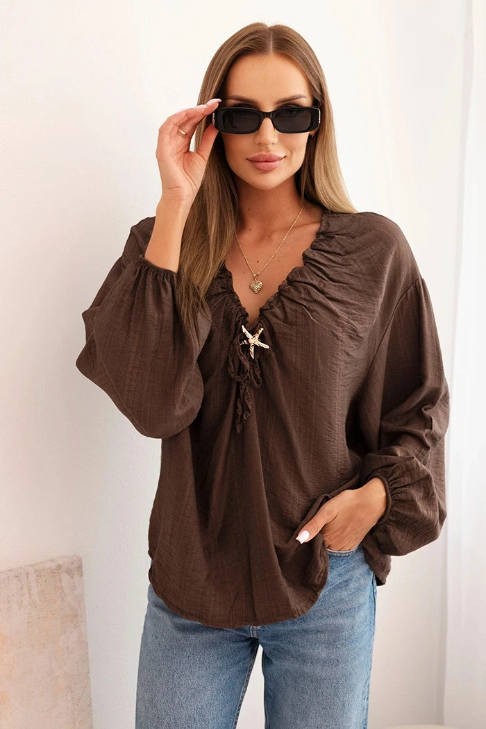 Dámská blůza s viskózou s nařaseným výstřihem a ozdobou hnědá