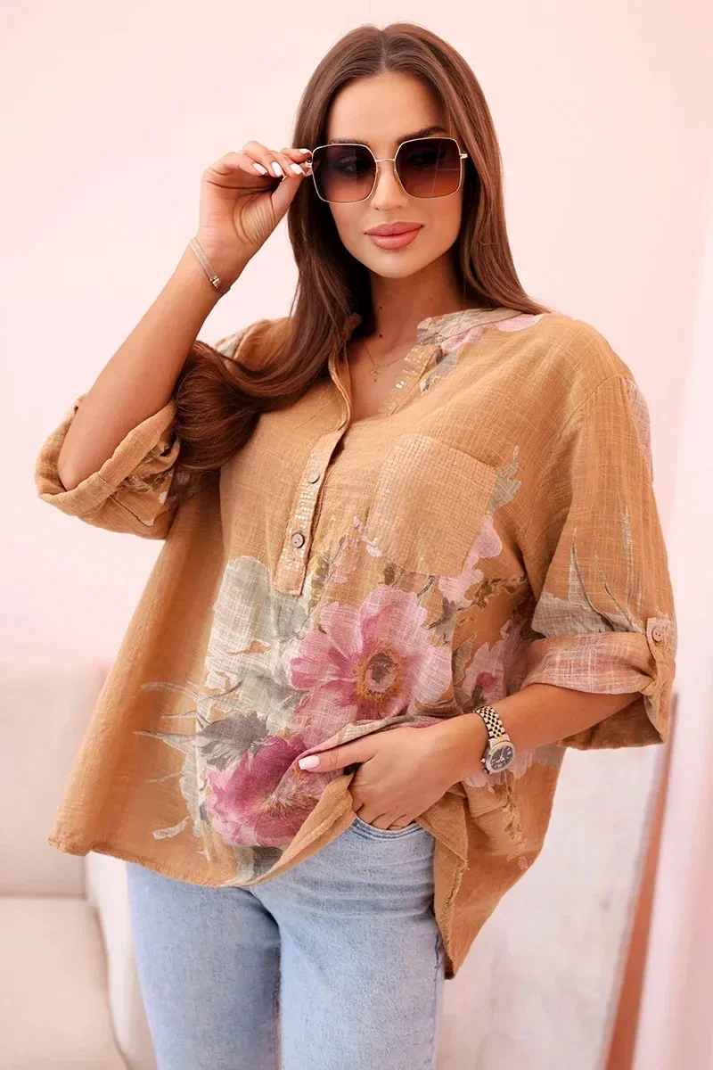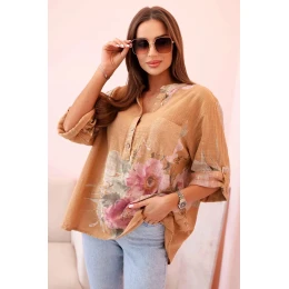 Dámská blůza z bavlny s květinovým vzorem a knoflíky - camelová