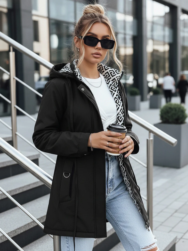 Stylová dámská bunda parka v módní černé barvě byla navržena s ohledem na pohodlí a moderní styl - je ideální pro přechodné období a chladnější dny. Má odepínací kapuci, praktické kapsy a stahovací šňůrku v pase, díky níž si můžete střih přizpůsobit své siluetě. Vnitřní stranu bundy zdobí módní kontrastní podšívka s geometrickým vzorem.