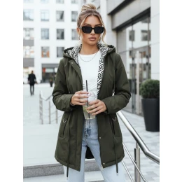Stylová dámská bunda parka v trendy zeleném odstínu byla navržena s ohledem na pohodlí a moderní styl - je ideální pro přechodné období a chladnější dny. Má odepínací kapuci, praktické kapsy a stahovací šňůrku v pase, díky níž si můžete střih přizpůsobit své postavě. Vnitřní stranu bundy zdobí módní kontrastní podšívka s geometrickým vzorem.