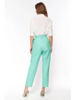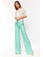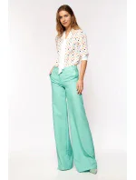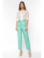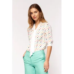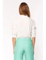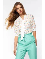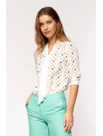 Přiléhavá halenka se zapínáním vpředu a výstřihem ve tvaru V, zapínání na knoflíky. Rukávy pod loktem s manžetami na knoflíky. Neprůsvitný materiál.
