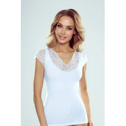 Výstřih ve tvaru písmene "V" je obšitý efektní krajkou, stejně jako rukávky. Zadní díl halenky je hladký.