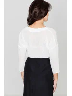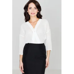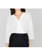 Halenka s 3/4 rukávy a zajímavým střihem. Má efektní obálkový výstřih s knoflíkem. Jemně transparentní. Skvěle se hodí k těsným kalhotám.