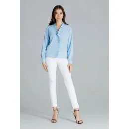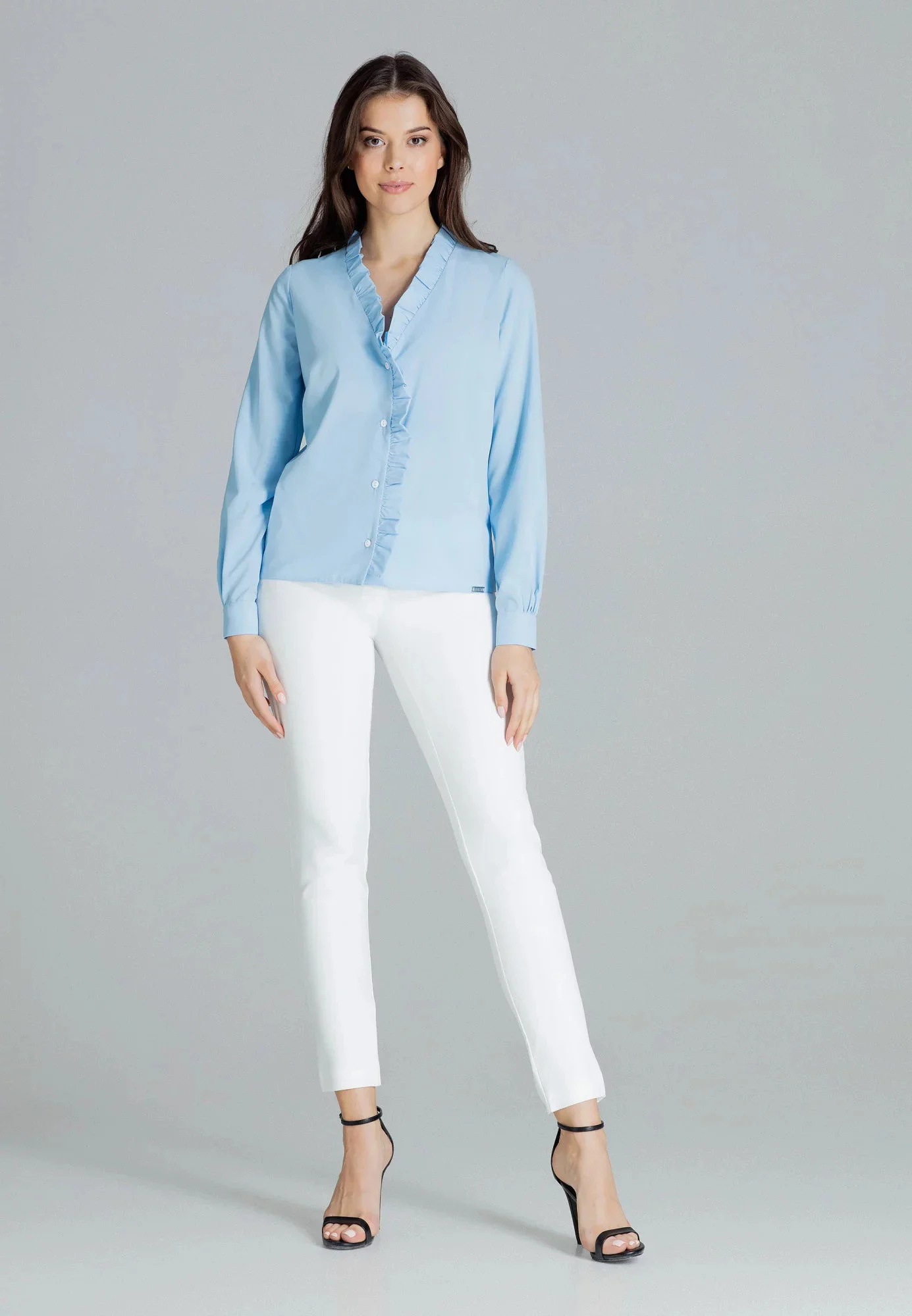 Klasická jednoduchá halenka s véčkovým výstřihem a volánem po celé délce. Dlouhý rukáv s nařasenou manžetou. Zapínání na knoflíky vpředu.