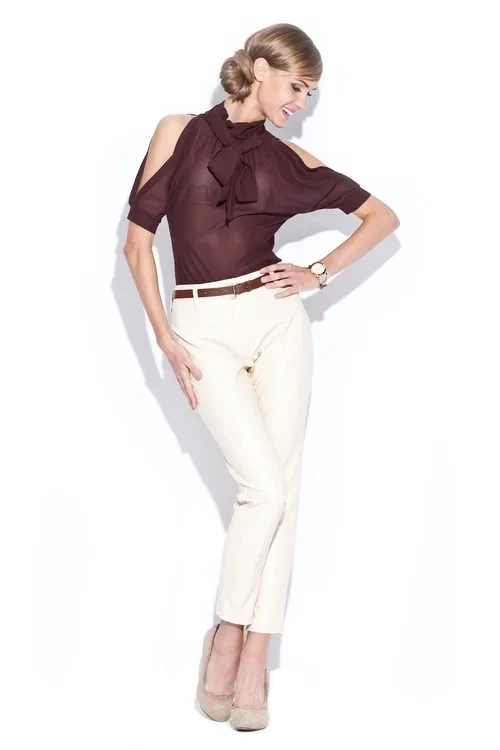 Dámská elegantní halenka M113 FIGL vyrobená z průsvitného materiálu s krátkými rukávy, které zdobí rozparky. Kolem krku je ozdobná stužka, se kterou si můžete uvázat nádhernou mašli.