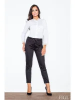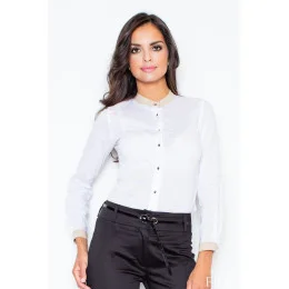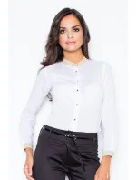 Bílá krátká jarní halenka s dlouhými rukávy a manžetou na knoflíky. Výstřih do V s ozdobným zavazováním na šerpu , zapínání vpředu na knoflíky.