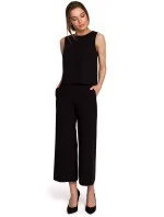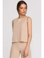Krátká halenka bez rukávů v trapézovém střihu s jemným výstřihem na zádech. Návrh pro milovníky klasické elegance i náročnější hledače módních oděvů. Halenka se zapíná na krytý zip.