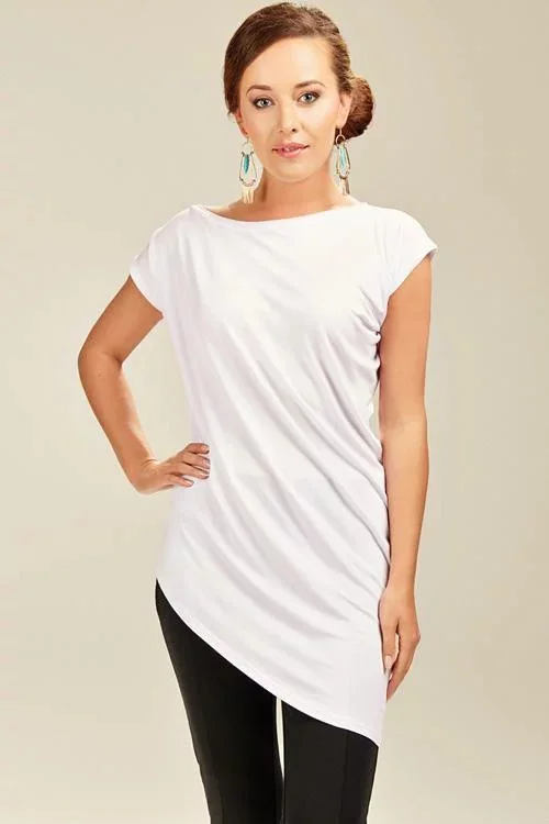 Módní dámská halenka (tunika) SHORELINE 008 typu OVERSIZE (volný střih) s krátkými rukávy v krémové barvě. Větší, šikmo ušitý kulatý výstřih kolem krku. Spodní část je šikmo střižena. Ideální na teplé večery. Vyrobeno z velmi kvalitního materiálu. Materiálové složení: 96% viskóza, 4% elastan. Velikosti: S až 3XL. Baleno v průhledném slídovém obalu. Limitovaná edice SHORELINE by Violana.