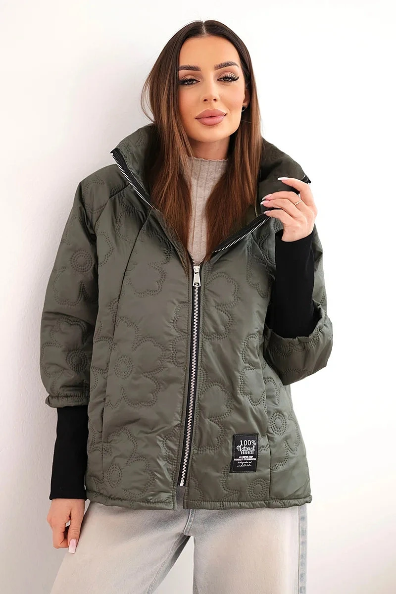 Dámská jarní prošívaná bunda s ozdobnou ražbou a zipem khaki