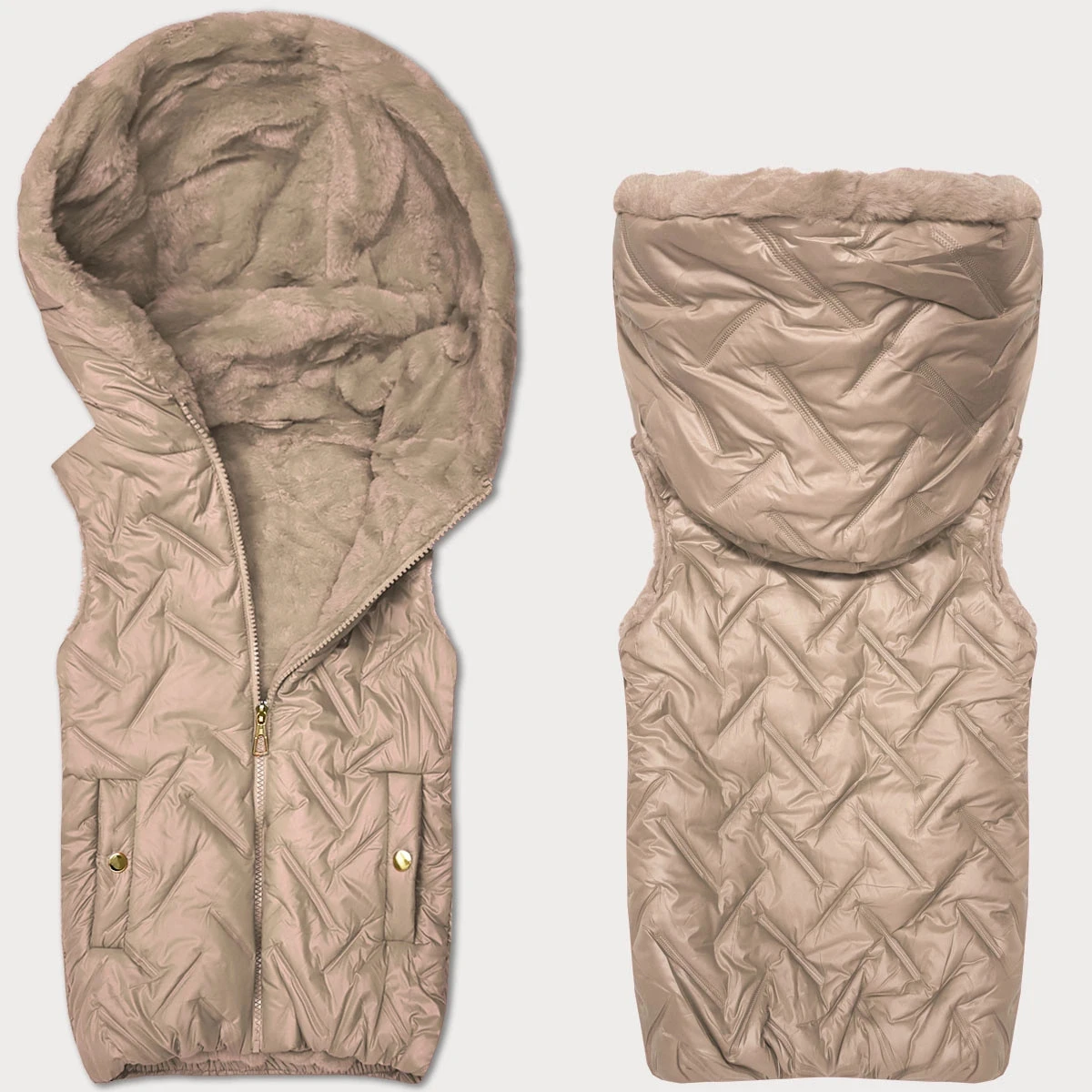 Vesta je lehce zateplená, má dvě kapsy se zapínáním na patentky a zapíná se zipem. Model má kapuci, kterou není možné odepnout. Ozdobné prvky mají zlatou barvu. Spodní část modelu je pružná. Vesta má délku k bokům.