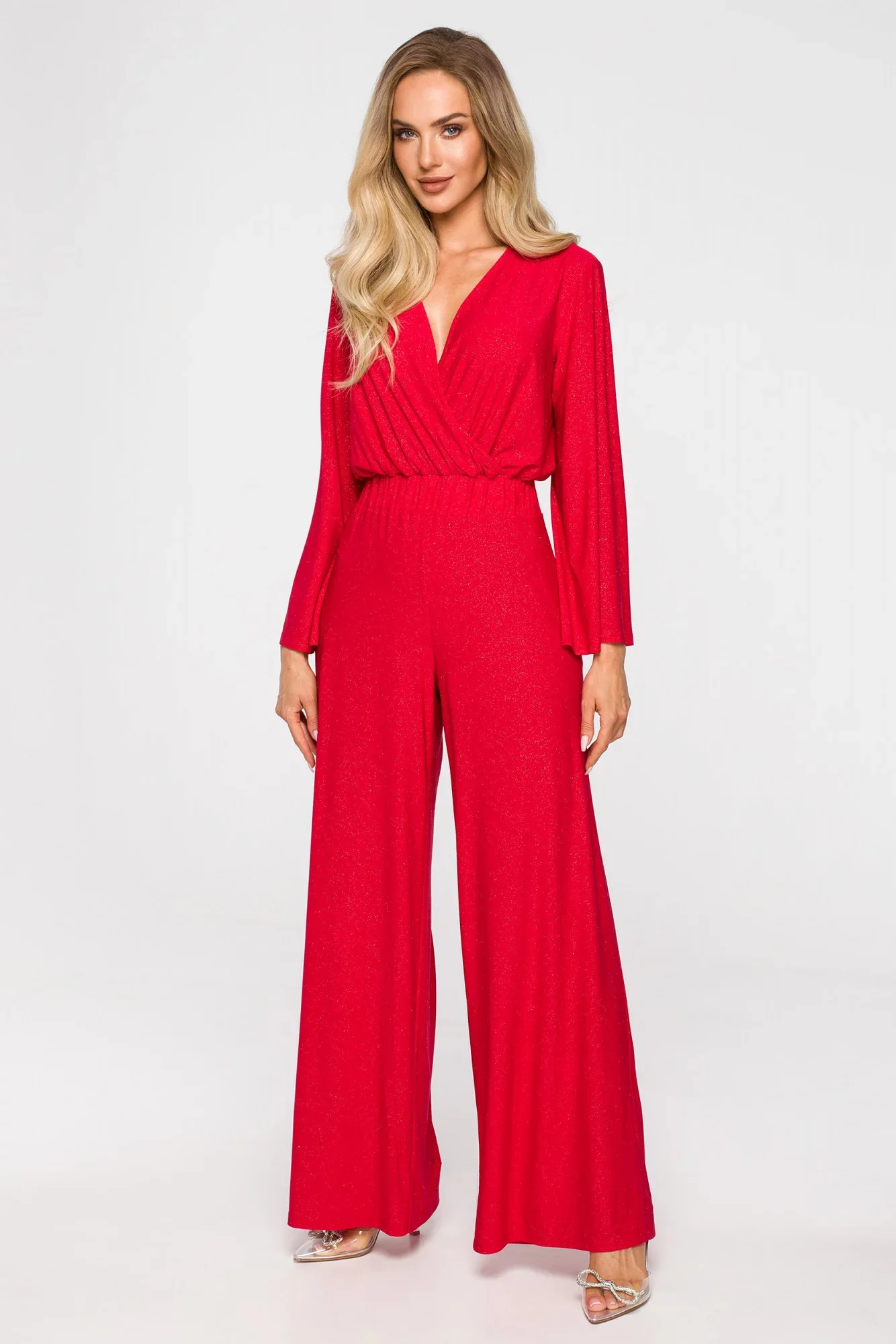 Tento krásný overal má řadu výhod. Je elegantní díky širokému střihu nohavic a rukávů, zavinovacímu vršku a jemnému řasení , je praktický a také pohodlný.