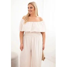 Dámská kombinéza Plus Size s bardot výstřihem, volánem a širokými nohavicemi béžový
