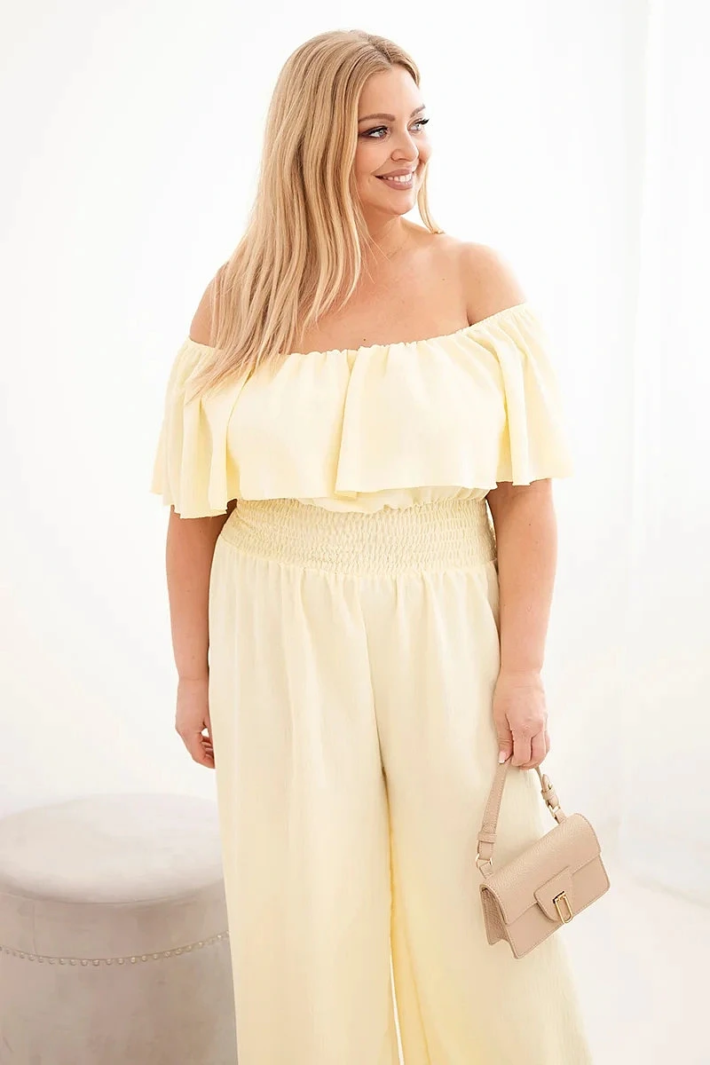 Dámská kombinéza Plus Size s odhalenými rameny, s volánem a širokými nohavicemi žlutý